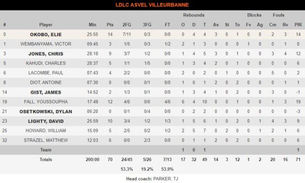 Με όπλο τα ριμπάουντ (49 συνολικά!) η Βιλερμπάν αξιοποίησε τις απουσίες των Σενγκέλια – Μιλουτίνοφ και χτύπησε τους Ρώσους στη ρακέτα με τον εκπληκτικό Γιουσουφά Φαλ που έκανε double double με 12 πόντους και 10 ριμπάουντ.
