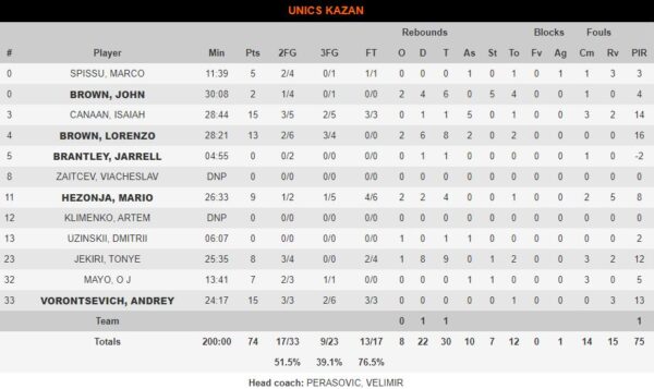 Ο Κάνααν με 15 πόντους και ο Λορέντσο Μπράουν με 13 ξεχώρισαν για τους Ρώσους που υπέπεσαν σε 12 λάθη, με τον Τζεκίρι να μαζεύει τα 9 ριμπάουντ και τον Χεζόνια να έχει μόλις 9 πόντους και να είναι απογοητευτικός.