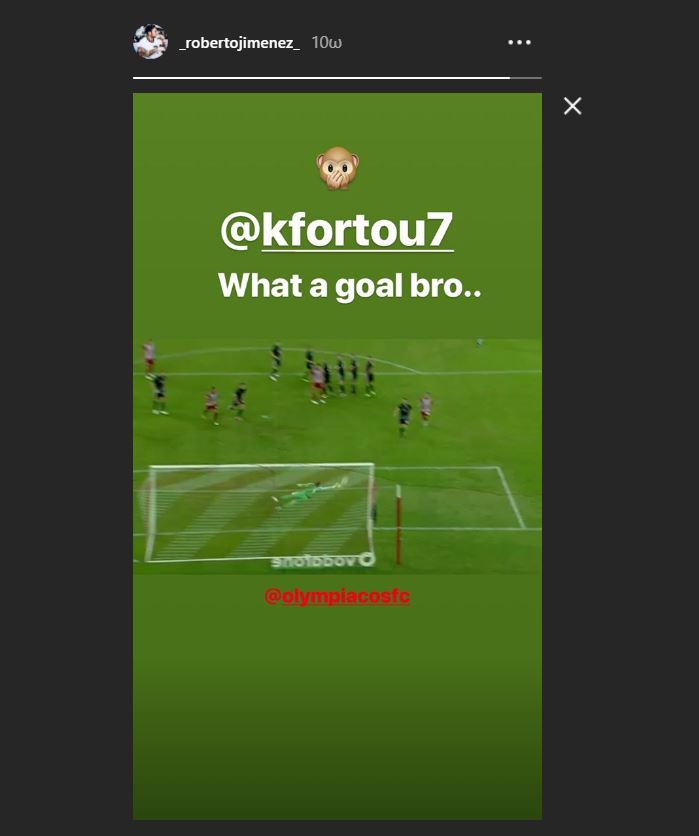 «Τι γκολ αδερφέ», ανέβασε στο Instagram Story o Ρομπέρτο δείχνοντας τον θαυμασμό του για την αριστουργηματική εκτέλεση στο 1-0 από τον αρχηγό του Ολυμπιακού.