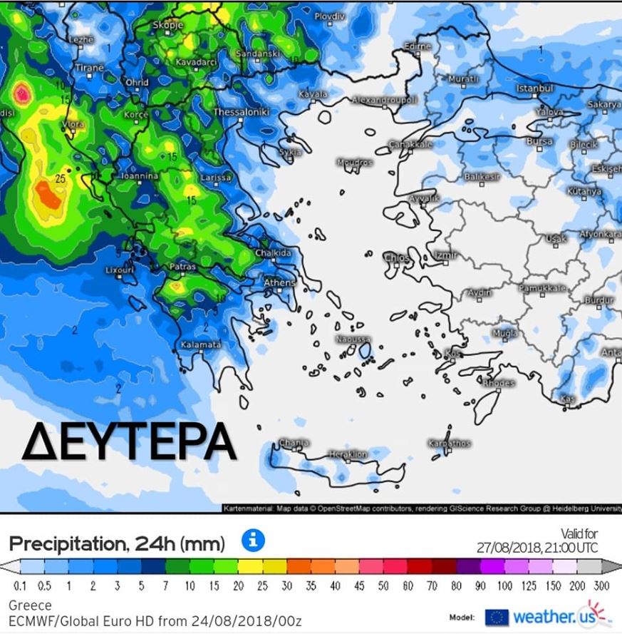 Οι συγκεκριμένοι χάρτες, είναι χάρτες πρόγνωσης των βροχοπτώσεων κατά τη διάρκεια του 24ώρου, τόσο της Δευτέρας, όσο και της Τρίτης.