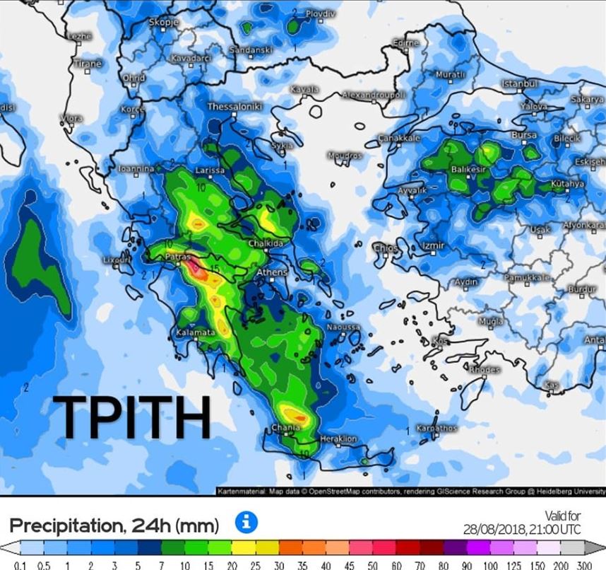 Για να γίνει κατανοητός ο χάρτης, όσο πιο αχνά μπλε χρώματα βλέπετε, τόσο πιο λίγες, εξασθενημένες και τοπικού χαρακτήρα θα είναι οι βροχές. Όσο πιο σκούρα είναι τα μπλε χρώματα και ιδιαιτέρως εάν η χρωματική κλίμακα πηγαίνει προς τις πράσινο – πορτοκαλί αποχωρήσεις, τόσο πιο έντονες η ακόμη και γενικευμένες θα είναι οι βροχοπτώσεις και οι τοπικές καταιγίδες.