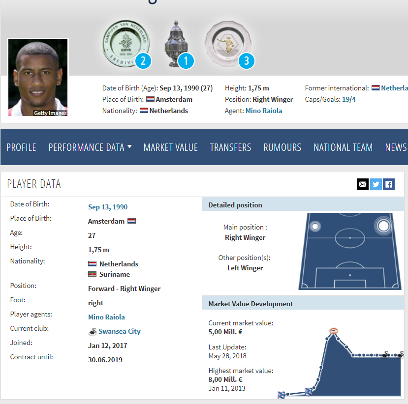 Ο 27χρονος Ολλανδός εξτρέμ φημίζεται για την ταχύτητά του και η καριέρα του μόνο τυχαία δεν είναι. Έχει γράψει 19 διεθνείς συμμετοχές με την πορτοκαλί φανέλα στο διάστημα 2012 – 2016 και τον Γενάρη του 2017 η Σουόνσι τον αγόρασε από την Αϊντχόφεν με 4,5 εκ. ευρώ.