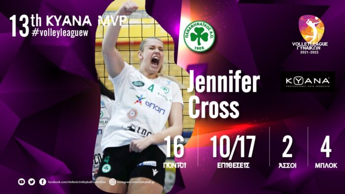 Η Τζένιφερ Κρος του Παναθηναϊκού αναδείχθηκε KYANA MVP της 13ης αγωνιστικής της Volley League Γυναικών (που ολοκληρώθηκε την Τετάρτη 15/12 με την εξ αναβολής αναμέτρηση ΑΟ Μαρκοπούλου Revoil-Πανναξιακός).