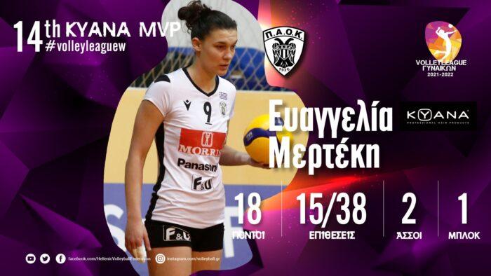 Η ανακοίνωση της ΕΟΠΕ: «Η Ευαγγελία Μερτέκη του Π.Α.Ο.Κ. αναδείχθηκε KYANA MVP της 14ης αγωνιστικής της Volley League Γυναικών. Η διεθνής ακραία του Δικεφάλου στο ντέρμπι κόντρα στον Α.Ο. Θήρας στη Σαντορίνη ήταν η πρώτη σκόρερ με 18 πόντους (15/38 επ., 2 άσσους, 1 μπλοκ), έχοντας μόλις δύο λάθη στην υποδοχή σε 22 προσπάθειες.