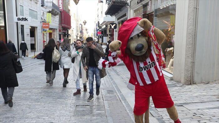 Η αγαπημένη μασκότ του Ολυμπιακού για μικρούς και μεγάλους μοίρασε χαμόγελα στην Ερμού όπου βρίσκονταν εκατοντάδες κόσμου για τα τελευταία τους ψώνια ενόψει Χριστουγέννων.