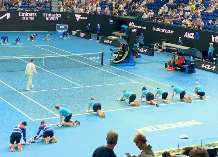 Η οροφή άρχισε σιγά – σιγά να κλείνει μόλις έκαναν την εμφάνισή τους οι πρώτες σταγόνες, ωστόσο η βροχή δεν… εκτίμησε την ταχύτητα του στέγαστρου και άρχισε να πέφτει πιο δυνατά, με αποτέλεσμα να βγουν οι ομπρέλες στην εξέδρα και οι πετσέτες στο κορτ.