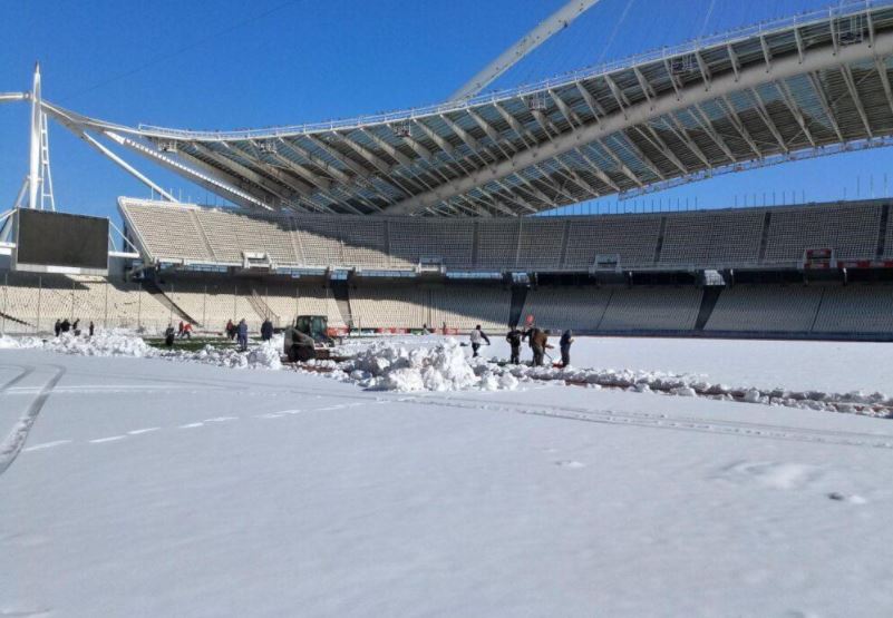 Η πυκνή χιονόπτωση σε όλη την Αττική και ιδιαίτερα στα βόρεια προάστια είχε ως αποτέλεσμα να καλυφθεί με χιόνι -και- ο αγωνιστικός χώρος του ΟΑΚΑ, λίγες ημέρες πριν την εντός έδρας αναμέτρηση της ΑΕΚ με τον Βόλο.
