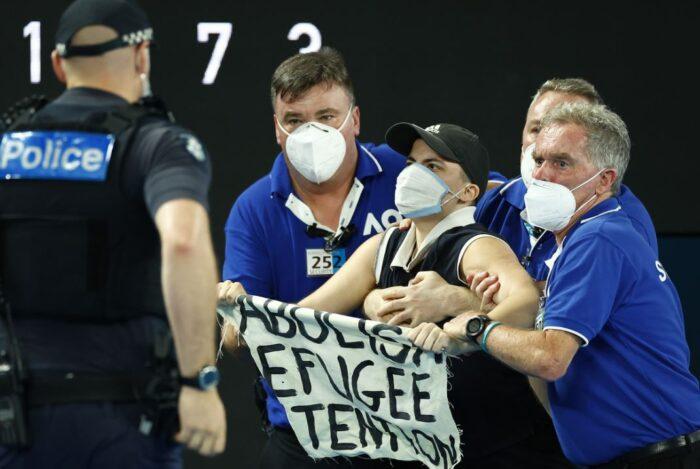 Ο άνδρας μπήκε στο κορτ στο 5-3 του β’ σετ υπέρ του Ισπανού, κρατώντας ένα πανό που έγραφε «Καταργήστε την κράτηση των προσφύγων». Η… επίσκεψή του πάντως διήρκεσε ελάχιστα, αφού οι άνδρες της ασφάλειας έτρεξαν προς το μέρος του και τον οδήγησαν… σηκωτό στην πόρτα της εξόδου.
