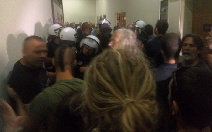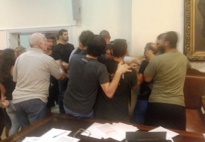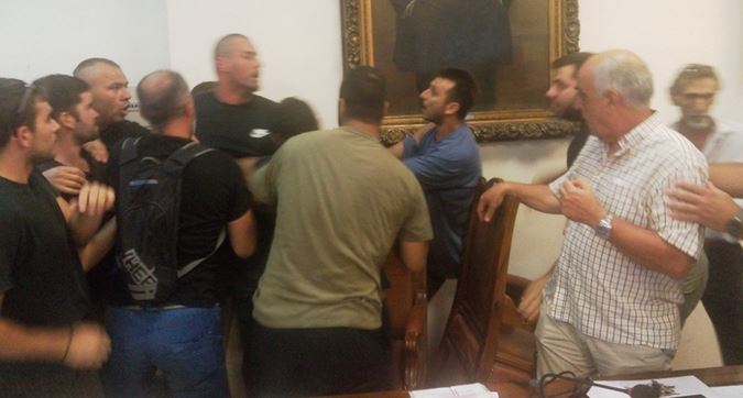 Σεκιουριτάδες μπήκαν μπροστά να προστατέψουν τον πρόεδρο Γιώργο Μουλά, που προήδρευε της συνεδρίασης, ενώ οι πολίτες να απαιτούσαν και να προσπάθησαν την απομάκρυνση των «φουσκωτών των γυμναστηρίων και των μπράβων της νύχτας» όπως κατήγγειλαν, με αποτέλεσμα να μπουν μέσα στο δημαρχιακό μέγαρο και στην αίθουσα του δημοτικού συμβουλίου ισχυρές δυνάμεις των ΜΑΤ για να ελέγξουν και να ηρεμήσουν την κατάσταση.