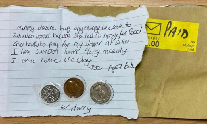 «Η μαμά μου δεν με φέρνει στο γήπεδο επειδή δεν φτάνουν τα χρήματα. Δεν έχει λεφτά για φαγητό και πρέπει να μου πληρώνει για να τρώω στο σχολείο. Μου αρέσει ο Χάρι ΜακΚίντι, μία μέρα θα έρθω», αναφέρει ο νεαρός φίλαθλος της Σουίντον στο γράμμα – δωρεά του που συγκίνησε την Αγγλία και φυσικά τη διοίκηση της ομάδας που αγωνίζεται στη National League του αγγλικού ποδοσφαίρου και θέλει να βοηθήσει με πράξεις τον νεαρό υποστηρικτή της και τη μητέρα του.