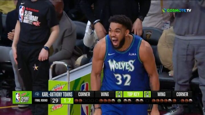Ο Καρλ-Άντονι Τάουνς των Μινεσότα Τίμπεργουλβς κατέκτησε με στυλ, φόρα και ρεκόρ τον φετινό λαμπερό διαγωνισμό τριπόντων στο All-Star Game του NBA.