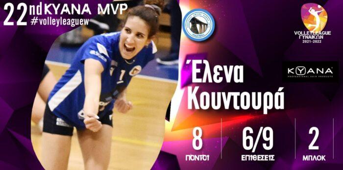 Η Έλενα Κουντουρά είναι η KYANA MVP της 22ης αγωνιστικής της Volley League Γυναικών. Η αρχηγός και πασαδόρος του ΑΟ Λαμίας 2013 ηγήθηκε της μεγάλης νίκης της ομάδας της με 3-2 σετ στην έδρα του ΠΑΟΚ, αποτέλεσμα που δίνει στον ΑΟΛ το προβάδισμα για την κατάκτηση της όγδοης θέσης που οδηγεί στα πλέι οφ.