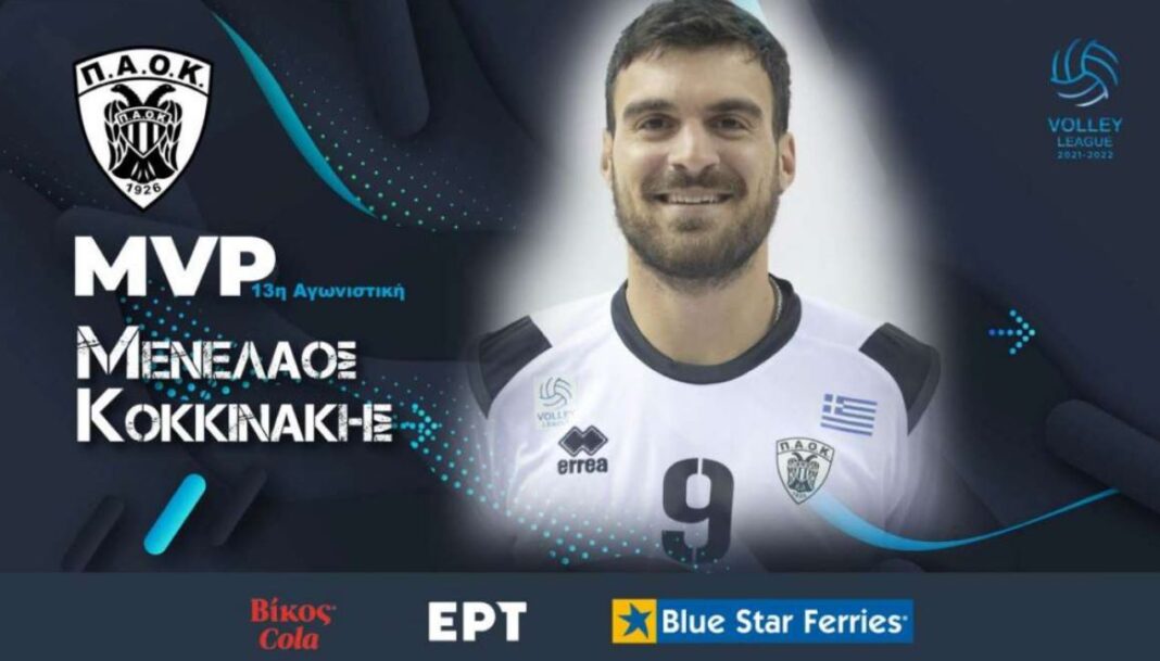 Η ανακοίνωση της ΕΣΑΠ: «Ο διεθνής λίμπερο του Π.Α.Ο.Κ. Μενέλαος Κοκκινάκης αναδείχτηκε MVP Βίκος Cola στην 13η αγωνιστική της Α΄φάσης του πρωταθλήματος Volley League 2021-22.