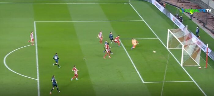 Ο Ντε Ρουν έβγαλε τρομερή κάθετη πάσα στην πλάτη της άμυνας για τον Μέλε, με τον Λαλά να μπαίνει προσωρινά μπροστά από τον Δανό μπακ αλλά να μην απομακρύνει με αποτέλεσμα ο ποδοσφαιριστής της Αταλάντα να πλασάρει τον Βατσλίκ για το 0-1 στο Καραϊσκάκη.