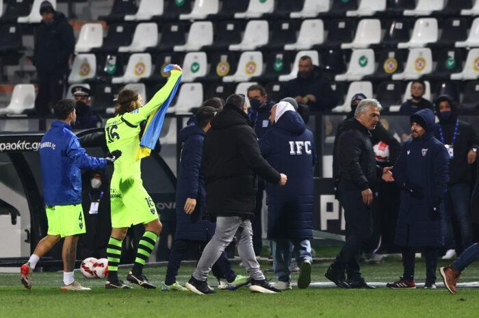 Ο Ντμίτρο Τσιγκρίνσκι πήρε την ουκρανική σημαία από τον πάγκο και τη σήκωσε με τους υπόλοιπους συμπαίκτες του, ενώ έδειξε μήνυμα στο μπλουζάκι που φορούσε κάτω από τη φανέλα και ήταν γραμμένο στα ουκρανικά.
