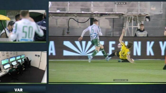 Οι Πράσινοι – αφού πρώτα η φάση ελέγχθηκε από το VAR – κέρδισαν πέναλτι στο μαρκάρισμα του Ρότα στον Αλεξανδρόπουλο με τις τάπες στον αστράγαλο, με τον Νόμπρε να δείχνει απλώς την κίτρινη κάρτα στον παίκτη της Ένωσης και με τον Αϊτόρ να γράφει το 1-0 από την άσπρη βούλα.