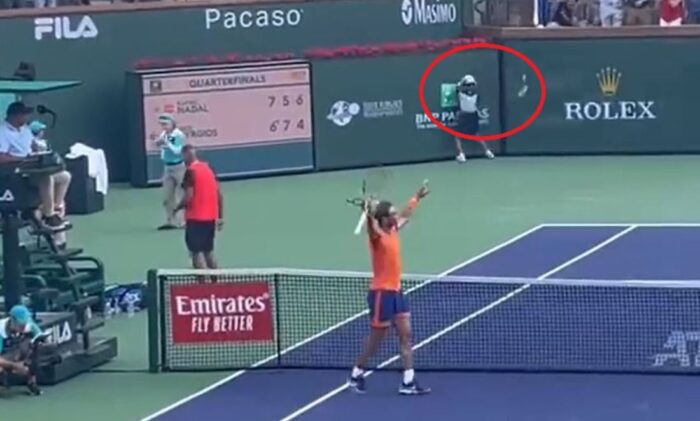 Αφού… παραπλάνησε τον κόσμο χαιρετώντας πολιτισμένα αντίπαλο και διαιτητή και την ώρα που ο Ισπανός πανηγύριζε την πρόκρισή του στα ημιτελικά, ο Κύργιος πέταξε τη ρακέτα του στο κορτ με τόση δύναμη, που αυτή αναπήδησε και κόντεψε να χτυπήσει ένα εκ των ball boys! Ευτυχώς το αγόρι είχε γρήγορα αντανακλαστικά και κατάφερε να αποφύγει το χτύπημα.