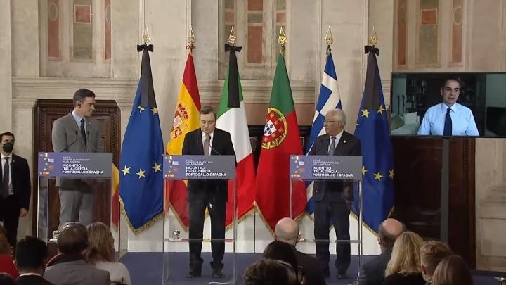 Η συνάντηση πραγματοποιείται στη Ρώμη ανάμεσα στον -οικοδεσπότη- Μάριο Ντράγκι, των πρωθυπουργών της Ισπανίας, Πέδρο Σάντσεθ και Πορτογαλίας, Αντόνιο Κόστα, καθώς και του Έλληνα πρωθυπουργού, ο οποίος συμμετείχε μέσω τηλεδιάσκεψης καθώς νοσεί με κορωνοϊό.