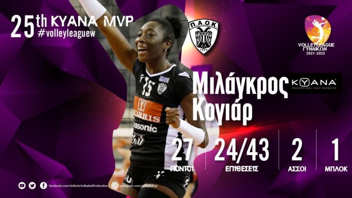 Η Μιλάγκρος Κογιάρ αναδείχθηκε KYANA MVP της 25ης αγωνιστικής της Volley League Γυναικών. Η Ισπανίδα διαγώνα του ΠΑΟΚ ήταν η πρώτη σκόρερ στο ντέρμπι με τον Άρη έχοντας 27 πόντους, οδηγώντας τον Δικέφαλο στη νίκη με 3-1 και στην εξασφάλιση της 3ης θέσης, μία αγωνιστική πριν το φινάλε της κανονικής περιόδου.