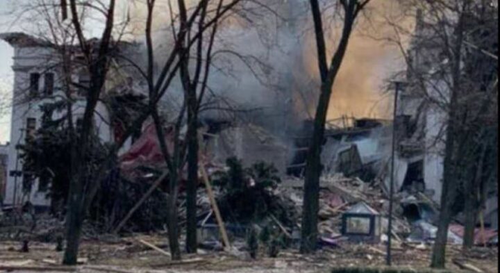 Το θέατρο αυτό στο κέντρο της Μαριούπολης υπέστη σοβαρές ζημιές από αεροπορικό πλήγμα στις 16 Μαρτίου.