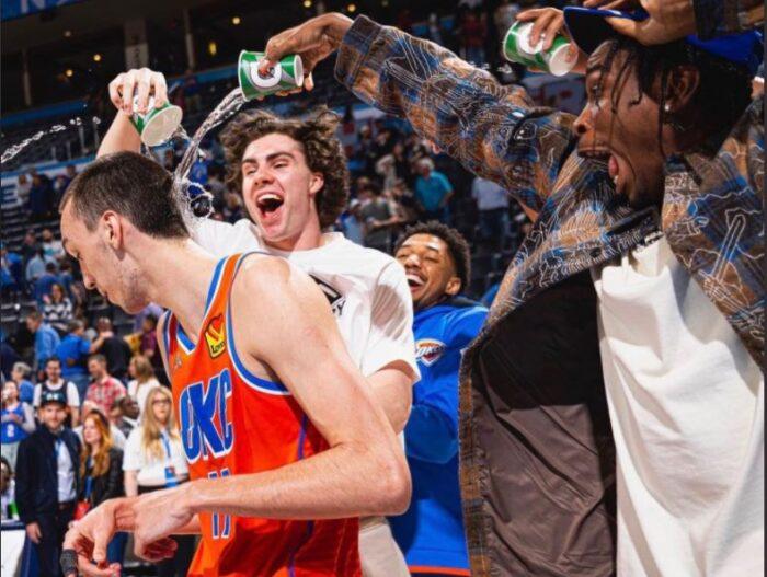 Οι παίκτες της Οκλαχόμα αιφνιδίασαν τον Ποκουσέφσκι λούζοντάς τον με νερό, ολοκληρώνοντας μια αξέχαστη βραδιά για τον νεαρό φόργουορντ.