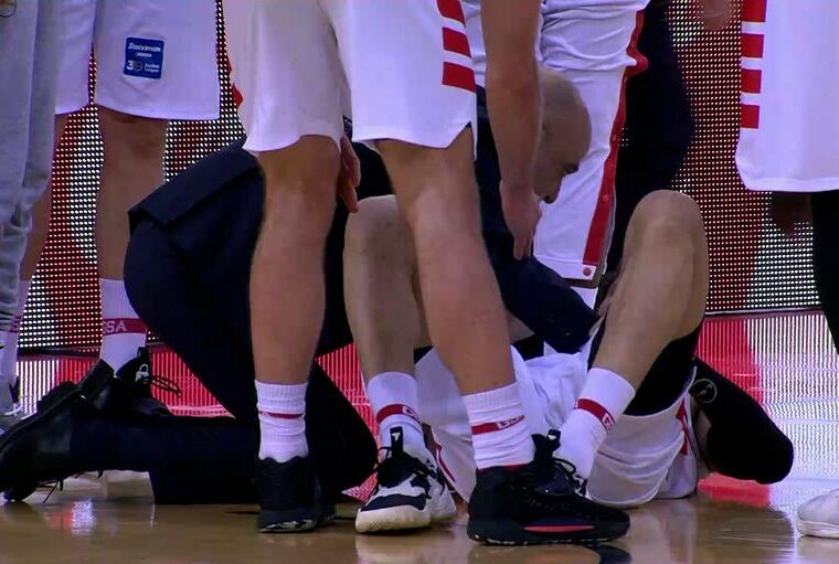 Παγωμάρα επικράτησε στο ΣΕΦ λίγα δευτερόλεπτα πριν από την ολοκλήρωση του πρώτου ημιχρόνου της αναμέτρησης του Ολυμπιακού με τον Άρη καθώς ο Μιχάλης Λούντζης στην προσπάθεια του να σκοράρει έπεσε άτσαλα στο παρκέ.