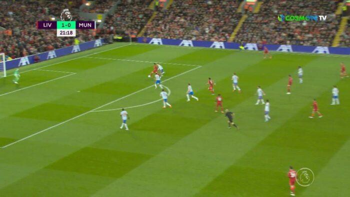 Μόλις στο 5′ οι γηπεδούχοι βρήκαν ψηλά την άμυνα των φιλοξενούμενων και με γρήγορες πάσες έβγαλαν τρεις παίκτες απέναντι σε δύο. Ο Σαλάχ από τα δεξιά έγινε κάτοχος της μπάλας και με παράλληλο γύρισμα βρήκε τον Λουίς Ντίας που έστειλε την μπάλα σαν σε προπόνηση στα δίχτυα για το 1-0.