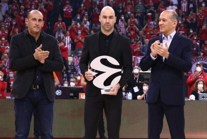Πριν το τζάμπολ ο Σπανούλης βραβεύτηκε από τους προέδρους της ΚΑΕ Ολυμπιακός, Παναγιώτη και Γιώργο Αγγελόπουλο αλλά και από τον Ζόρντι Μπερτομέου