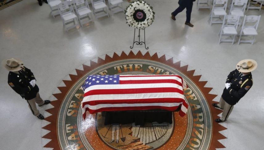 Με τιμές υποδέχτηκε η Αριζόνα τη σορό του εκλιπόντος Γερουσιαστή Τζον Μακέιν. Το φέρετρο έφτασε συνοδεία μεγάλης πομπής μοτοσικλετιστών στο Καπιτώλιο της πολιτείας, όπου και θα παραμείνει προκειμένου να του αποδοθούν οι πρέπουσες τιμές.
