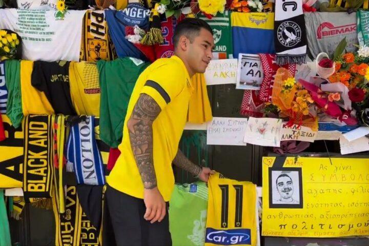 Ο Σέρχιο Αραούχο τιμά με τον δικό του τρόπο και σεβασμό τη μνήμη του αδικοχαμένου Άλκη Καμπανού και με αφορμή τη σημερινή αναμέτρηση της ΑΕΚ με τον Άρη στο «Κλεάνθης Βικελίδης» (20:00) βρέθηκε στην αποστολή, παρότι τραυματίας με θλάση στον προσαγωγό, και άφησε τη φανέλα του στο σημείο που δολοφονήθηκε ο 19χρονος φίλαθλος των Κίτρινων της Θεσσαλονίκης.