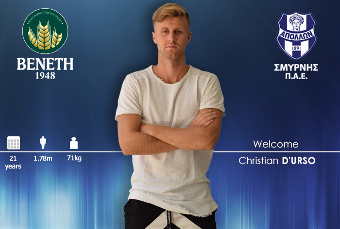 Διαβάστε ανακοίνωση της ΠΑΕ: «Η ΠΑΕ Απόλλων Σμύρνης ανακοινώνει την απόκτηση του ποδοσφαιριστή Κριστιάν Ντ’ Ούρσο. Γεννημένος στις 26 Ιουλίου 1997, αγωνίζεται ως αμυντικός μέσος. Ανήκει στη Ρόμα και την τελευταία τριετία αγωνίστηκε δανεικός στις Λατίνα, Κάρπι και Άσκολι. Διεθνής με τις μικρές Εθνικές ομάδες της Ιταλίας, αποκτήθηκε με τη μορφή δανεισμού από τη Ρόμα».
