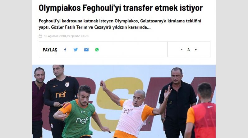 Στην Τουρκία αναφέρουν πως ο Ολυμπιακός έχει κάνει πρόταση στη Γαλατασαράι για δανεισμό του Σοφιάν Φεγκουλί.
