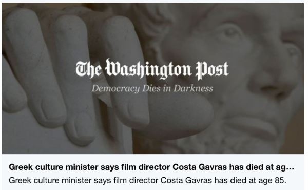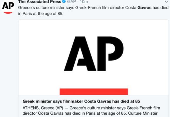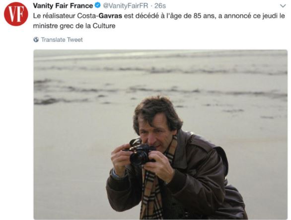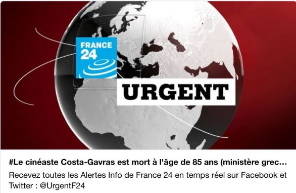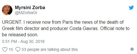 «Επείγον. Μόλις ενημερώθηκα από το Παρίσι την είδηση του θανάτου του Ελληνα σκηνοθέτη και παραγωγού Κώστα Γαβρά. Οι επίσημες ανακοινώσεις σε λίγο.