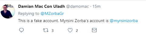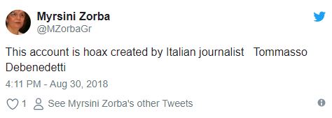 Ο λογαριασμός όντως ήταν ψεύτικος και τελικά διεγράφη από τον ίδιο τον διακινητή των fake news και έτσι έμεινε η απορία, για το αν η υπουργός γνωρίζει τελικά ποιος είναι ο λογαριασμός της στο twitter.