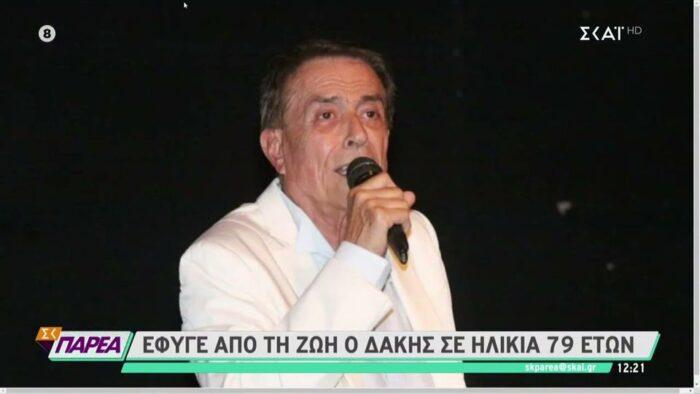 Έφυγε από τη ζωή, σε ηλικία 79 ετών, ο τραγουδιστής Δάκης μετά από μάχη με τον καρκίνο. Την είδηση γνωστοποίησε σε ανάρτησή της στο Facebook η Λουκίλα Καρρέρ-Πλέσσα, σύζυγος του Μίμη Πλέσσα.