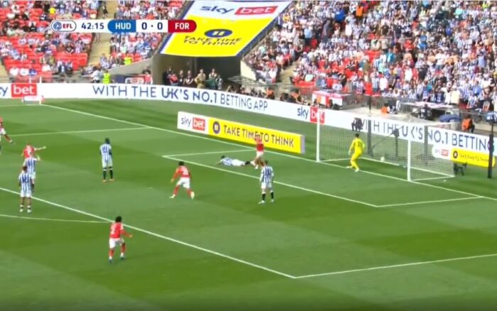 Με τη συμπλήρωση 43 λεπτών μια σέντρα στην καρδιά της περιοχής από τον Γκάρνερ αιφνιδίασε την άμυνα της Χάντερσφιλντ με τον Κόλγουιλ να βάζει προβολή για να απομακρύνει αλλά άθελά του να στέλνει την μπάλα στα δίχτυα της ομάδας του για το 1-0 της Νότιγχαμ.