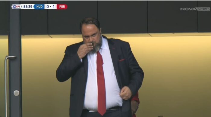 Ο ιδιοκτήτης της Νότιγχαμ, Βαγγέλης Μαρινάκης, παρακολούθησε την αναμέτρηση από τα επίσημα με μεγάλη αγωνία και όσο κυλούσαν τα λεπτά προς το τέλος, τόσο μεγαλύτερο ήταν και το άγχος του.