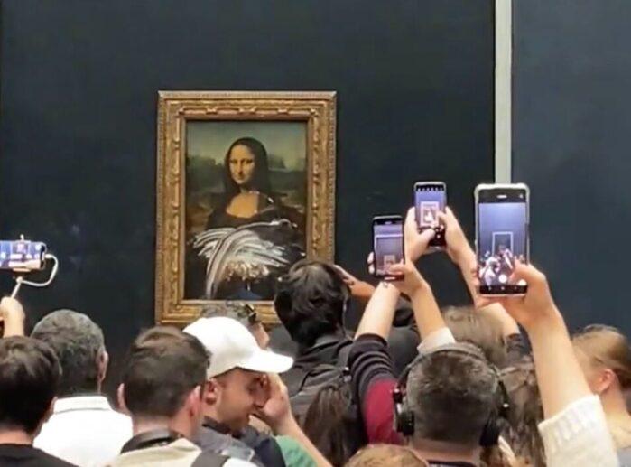 Οι λάτρεις της τέχνης στο Μουσείο της Λούβρου στο Παρίσι έμειναν έκπληκτοι όταν μια «ηλικιωμένη γυναίκα» σηκώθηκε ξαφνικά από το αναπηρικό αμαξίδιό της για να… πετάξει μια τούρτα πάνω στον πίνακα της Μόνα Λίζα.