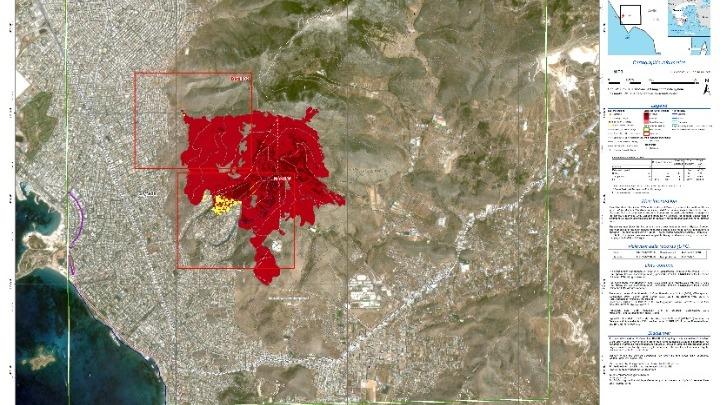 Αυτό προκύπτει από την καταγραφή που έκανε η Υπηρεσία Copernicus/Emergency Management Service – Mapping της Ευρωπαϊκής Ένωσης, μέσω του δορυφόρου της, η οποία ενεργοποιήθηκε από τη Διεύθυνση Σχεδιασμού και Αντιμετώπισης Εκτάκτων Αναγκών της Γενικής Γραμματείας Πολιτικής Προστασίας, κατόπιν εντολής του γενικού γραμματέα, Βασίλη Παπαγεωργίου, αμέσως μετά την οριοθέτηση της πυρκαγιάς, προκειμένου να γίνει η ακριβής αποτίμηση της κατεστραμμένης περιοχής.