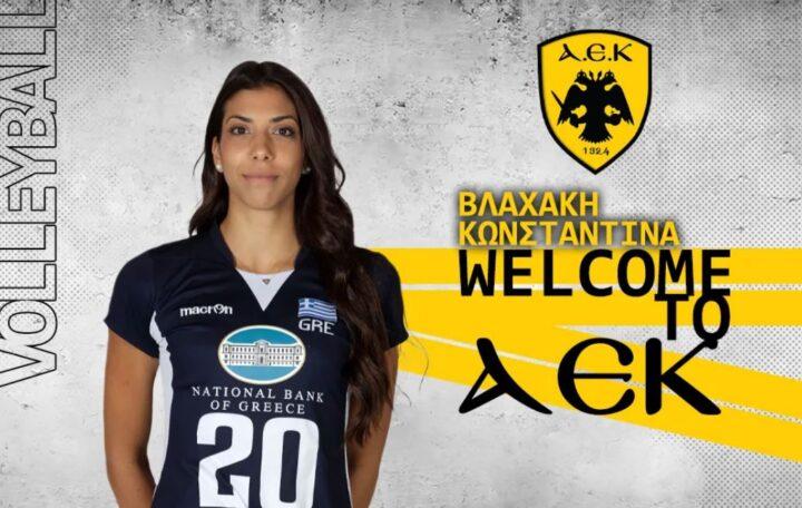 Η ανακοίνωση: «H AEK βρίσκεται στην ευχάριστη θέση να ανακοινώσει την έναρξη της συνεργασίας της με την Κωνσταντίνα Βλαχάκη. Η 27χρονη (08/05/1995) διεθνής ακραία, ύψους 1,79 μ., υπέγραψε μονοετές συμβόλαιο και εντάσσεται στο δυναμικό της γυναικείας ομάδας Βόλεϊ του Συλλόγου.