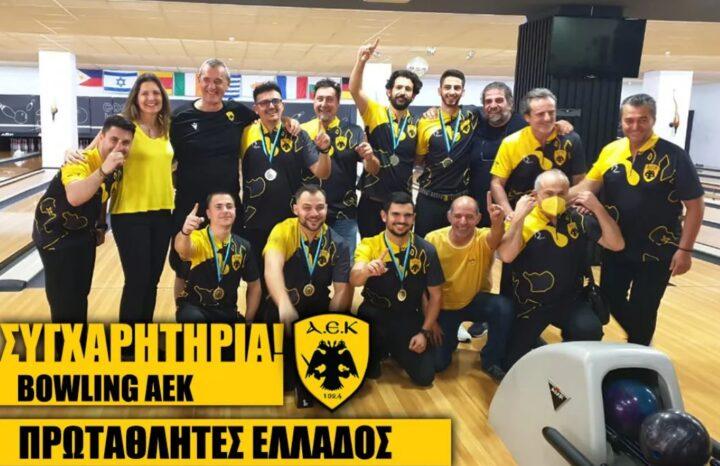 Πρωταθλήτρια για πρώτη φορά στην ιστορία της στο Πανελλήνιο Πρωτάθλημα Μπόουλινγκ Ανδρών αναδείχθηκε η ΑΕΚ. Η Ένωση κατέκτησε χρυσό μετάλλιο σε δύο από τα τρία αγωνίσματα για να αναδειχθεί πρωταθλήτρια.