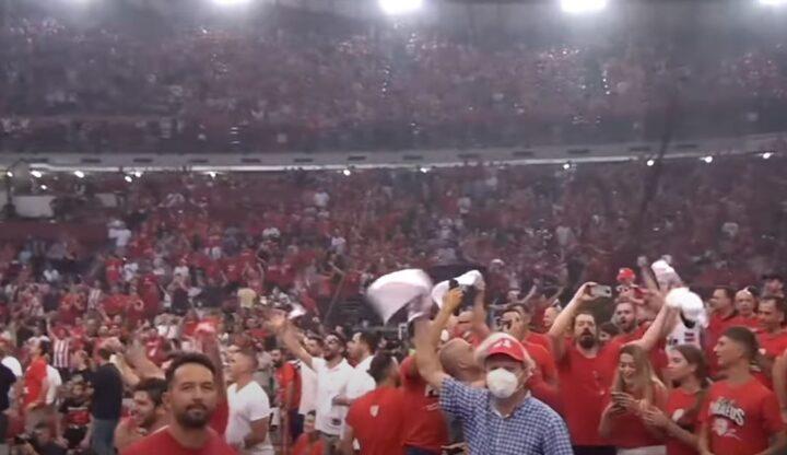Οι οπαδοί του Ολυμπιακού δημιούργησαν μια εκρηκτική ατμόσφαιρα πριν καν γίνει το πρώτο τζάμπολ ενώ ειδικά στα τελευταία λεπτά πριν τη λήξη του αγώνα έδωσαν… ρέστα με τα συνθήματα για την επιστροφή στην κορυφή του ελληνικού πρωταθλήματος.