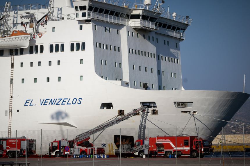 Επανέρχεται σταδιακά σε ορθή θέση, μετά από κλίση 7 μοιρών που πήρε λόγω μετακίνησης υδάτων από την πυρόσβεση, το επιβατηγό οχηματαγωγό πλοίο «Ελευθέριος Βενιζέλος».