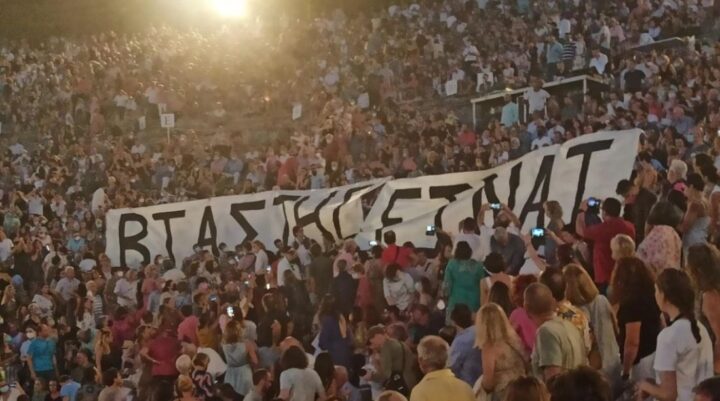 Ορισμένοι θεατές σήκωσαν δύο μεγάλα πανό, που γράφουν τη φράση «βιαστής είναι». Βίντεο δείχνει ότι το πανό έχει τραβήξει την προσοχή των θεατών, ενώ αρκετοί φωναζαν «μπράβο» και χειροκροτούσαν, ενώ δεν ήταν λίγοι όσοι έσπευσαν να βγάλουν τα κινητά τους για να απαθανατίσουν τη διαμαρτυρία.
