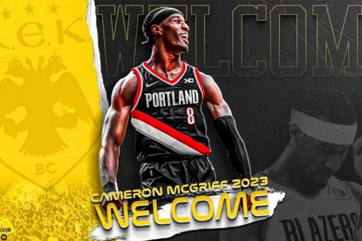 «H AEK ΒC βρίσκεται στην ευχάριστη θέση ν’ ανακοινώσει, ότι συνήψε συμφωνία με τον Κάμερον ΜακΓκρίφ (Cameron McGriff, 24 χρ., 2μ.01).