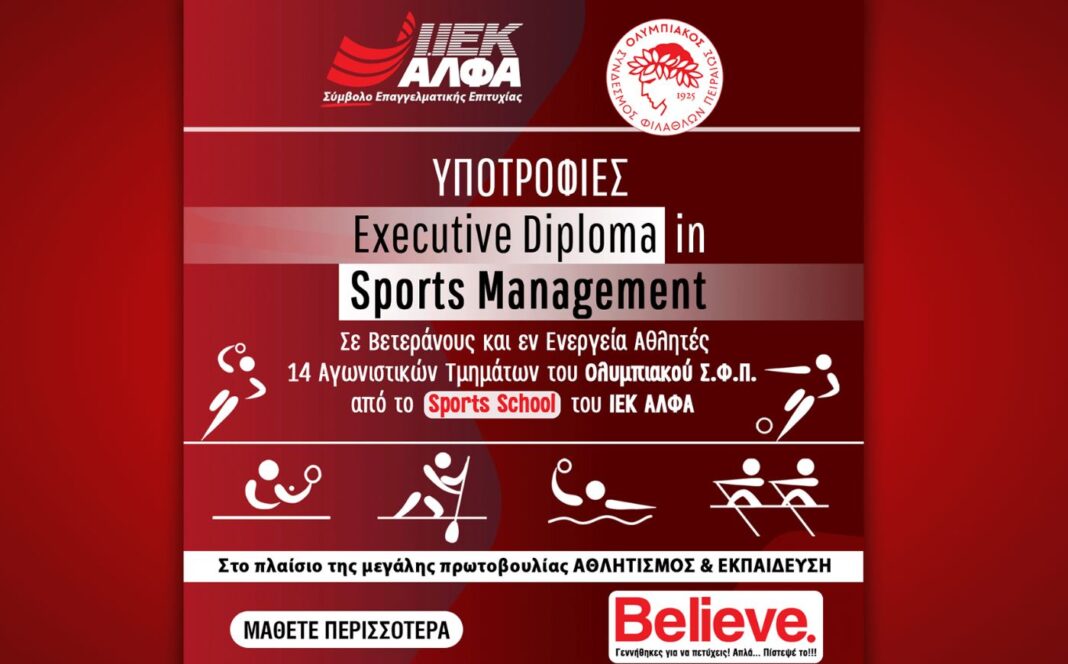 Με στόχο την ανάδειξη και ενίσχυση της μεγάλης πρωτοβουλίας «Αθλητισμός & Εκπαίδευση», που τυγχάνει υποστήριξης από μεγάλες αθλητικές προσωπικότητες και κορυφαίους αθλητικούς φορείς και συλλόγους, μεταξύ των οποίων και ο ΟΛΥΜΠΙΑΚΟΣ, το ΙΕΚ ΑΛΦΑ δημιουργεί τη φετινή ακαδημαϊκή χρονιά το εν λόγω αποκλειστικό τμήμα -από αθλητές/αθλήτριες του Ερασιτέχνη- για το πρόγραμμα «Executive Diploma in Sports Management» του ΑΛΦΑ studies (Κ.Δ.Β.Μ. 2), παρέχοντας πλήρεις υποτροφίες σε εν ενεργεία ή βετεράνους αθλητές -ήτοι 14 υποτροφίες σε 14 αγωνιστικά τμήματα του ΟΛΥΜΠΙΑΚΟΥ Σ.Φ.Π.!