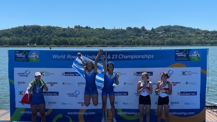 Στο μεταξύ, οι Σοφία Δαλίδου και Στυλιανή Νάτσιουλα πανηγύρισαν το χρυσό μετάλλιο στο διπλό σκιφ νεανίδων. Το ελληνικό πλήρωμα ολοκλήρωσε την προσπάθειά του σε 6:57.40 και ανέβηκε στο ψηλότερο σκαλί του βάθρου, αφήνοντας πίσω τους τις Ιταλίδες Αντζέλικα Ερπίνι και Φραντσέσκα Ρουμπέο (7:02.60), καθώς και τις Γερμανίδες Πάουλα Λουτς και Χέλενα Μπρένκε (7:03.15).