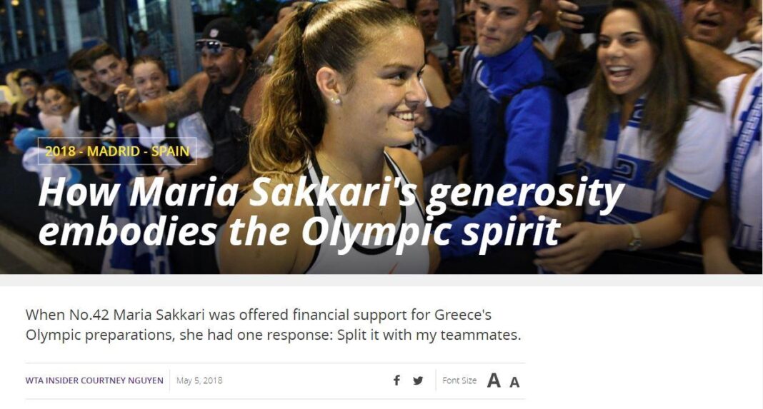 Για τούτο τον λόγο, ηWTA έκανε θέμα στην επίσημη ιστοσελίδα της για τη Μαρία Σάκκαρη, με τίτλο: «Πώς η γενναιοδωρία της Μαρίας Σακκάρη ενσαρκώνει το Ολυμπιακό πνεύμα». Στο εν λόγω άρθρο μάλιστα φιλοξενούνται δηλώσεις της 22χρονης, η οποία τόνισε: «Κάθε αθλητής στη χώρα μου παίρνει ένα ποσό για την προετοιμασία του για τους Ολυμπιακούς Αγώνες. Εγώ, ο Στέφανος και η Βαλεντίνη, βρισκόμαστε στην Ολυμπιακή προετοιμασία. Έλαβα ένα τηλεφώνημα από τον πρόεδρο και μου είπε πως έχει 25.060 ευρώ για μένα. Του είπα πως πρέπει να τα μοιράσουμε και οι 3 αθλητές, γιατί η Βαλεντίνη χρειάζεται τα χρήματα περισσότερο από εμένα και ο Στέφανος τα αξίζει το ίδιο με μένα. Όλοι δουλεύουμε το ίδιο σκληρά και θεωρώ πως όλοι αξίζουμε τα χρήματα. Του πρότεινα να τα μοιράσουμε, επειδή αυτό ήταν σωστό να γίνει. Οι Ολυμπιακοί Αγώνες ξεκίνησαν από την Ελλάδα. Για μένα είναι πολύ σημαντικό και ελπίζω να καταφέρω να συμμετάσχω».