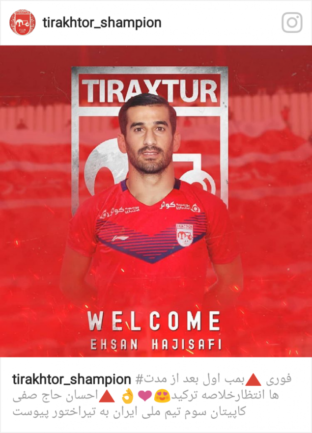 Η Τράκτορ Σάζι ανακοίνωσε μέσω social media τον Εχσάν Χατζισαφί, ο οποίος θα αγωνίζεται από τη νέα σεζόν στο πρωτάθλημα του Ιράν.