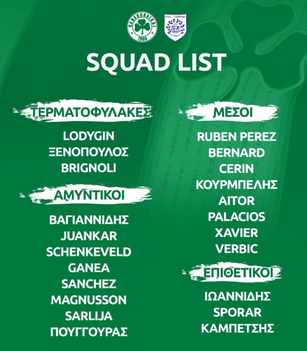 Ο Παναθηναϊκός ολοκλήρωσε την προετοιμασία του για την αναμέτρηση με τον ΠΑΣ Γιάννινα για την 5η αγωνιστική της Super League. Ο Ιβάν Γιοβάνοβιτς μετά την τελευταία προπόνηση ανακοίνωσε την αποστολή, από την οποία απουσιάζει το όνομα του Κώτσιρας λόγω τραυματισμού. Αντίθετα, κανονικά συμπεριλήφθηκαν Χουάνκαρ και Σένκεφελντ.